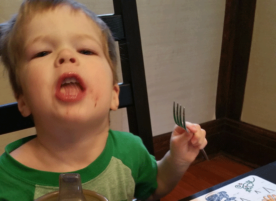 For the most part his protests are non-violent, but sometimes things get a little rough. Food is thrown, chairs are pushed, brothers are shoved, mom’s seat is kicked and dad’s face is scratched.